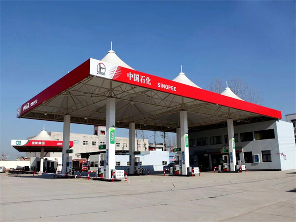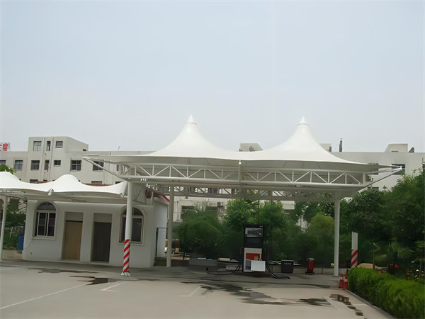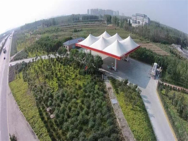 加油站膜结构,指的是覆盖在加油站上方的膜结构罩棚。加油站膜结构具有面的外遮阳功能,可以彻底阻挡紫外线的辐射,能够使室内的温度降低,减少空调负荷,不仅使车辆、人体免受紫外线的侵袭,而且大大延长了加油站设备的使用寿命。